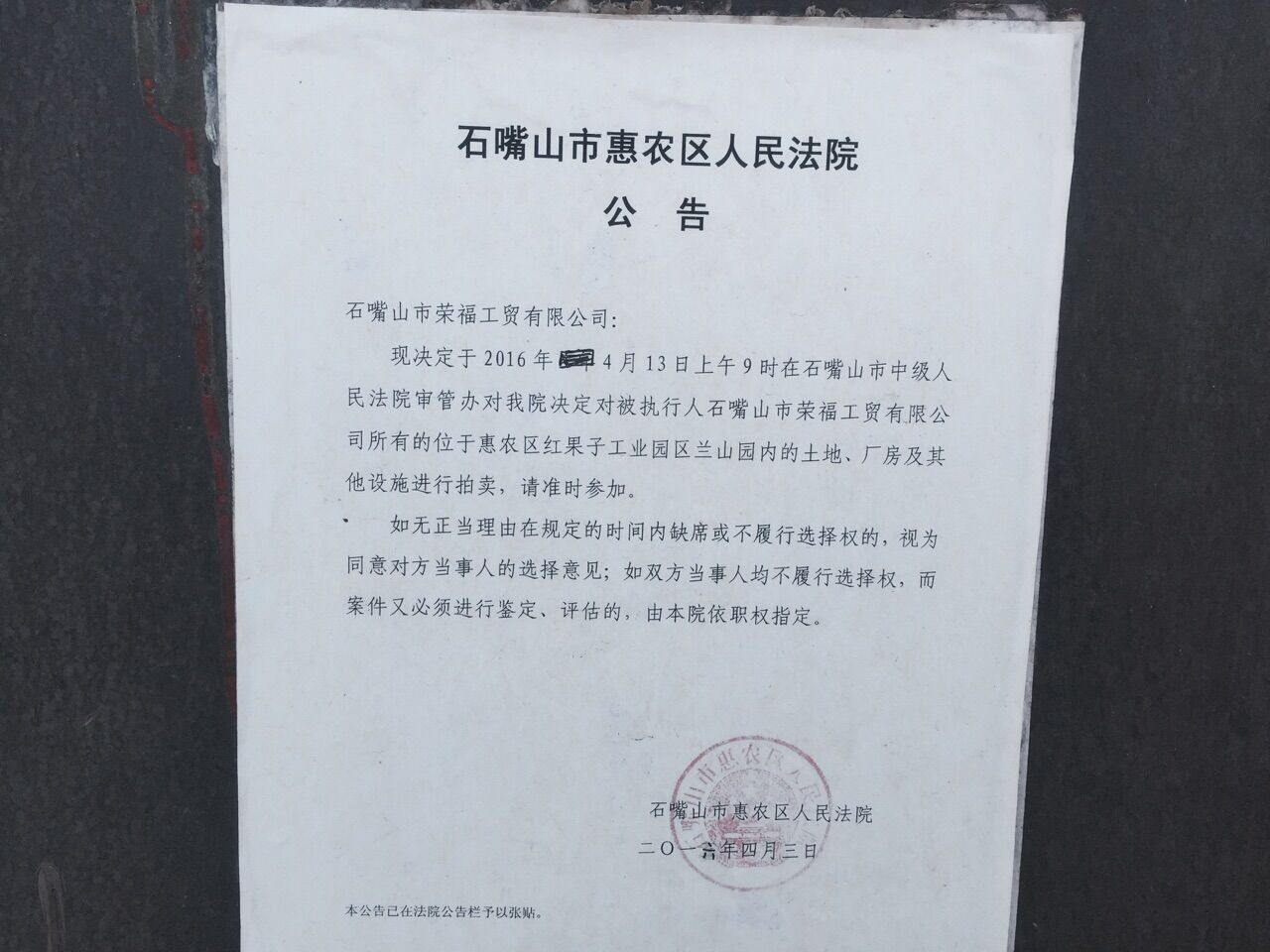 受石嘴山市惠農(nóng)區(qū)人民法院的委托,本公司定于2016年5月19日(星期四)15時舉行拍賣會對位于惠農(nóng)區(qū)紅果子鎮(zhèn)蘭山園內(nèi)的土地及地上建筑物、院內(nèi)設(shè)備進行公開拍賣。四至:東臨趙會友用地,南臨空地,西臨石嘴山市榮福工貿(mào)有限公司用地,北臨規(guī)劃路。其中:土地使用權(quán)面積6000平方米,工業(yè)用地;建筑物面積341.44平方米,為工業(yè)廠房;設(shè)備:跳汰洗煤機一套及高頻篩兩臺。